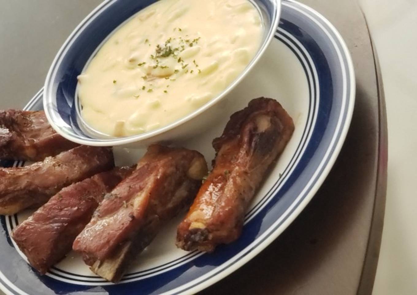 Crema de Papa y costillitas en salsa soya y azúcar negra