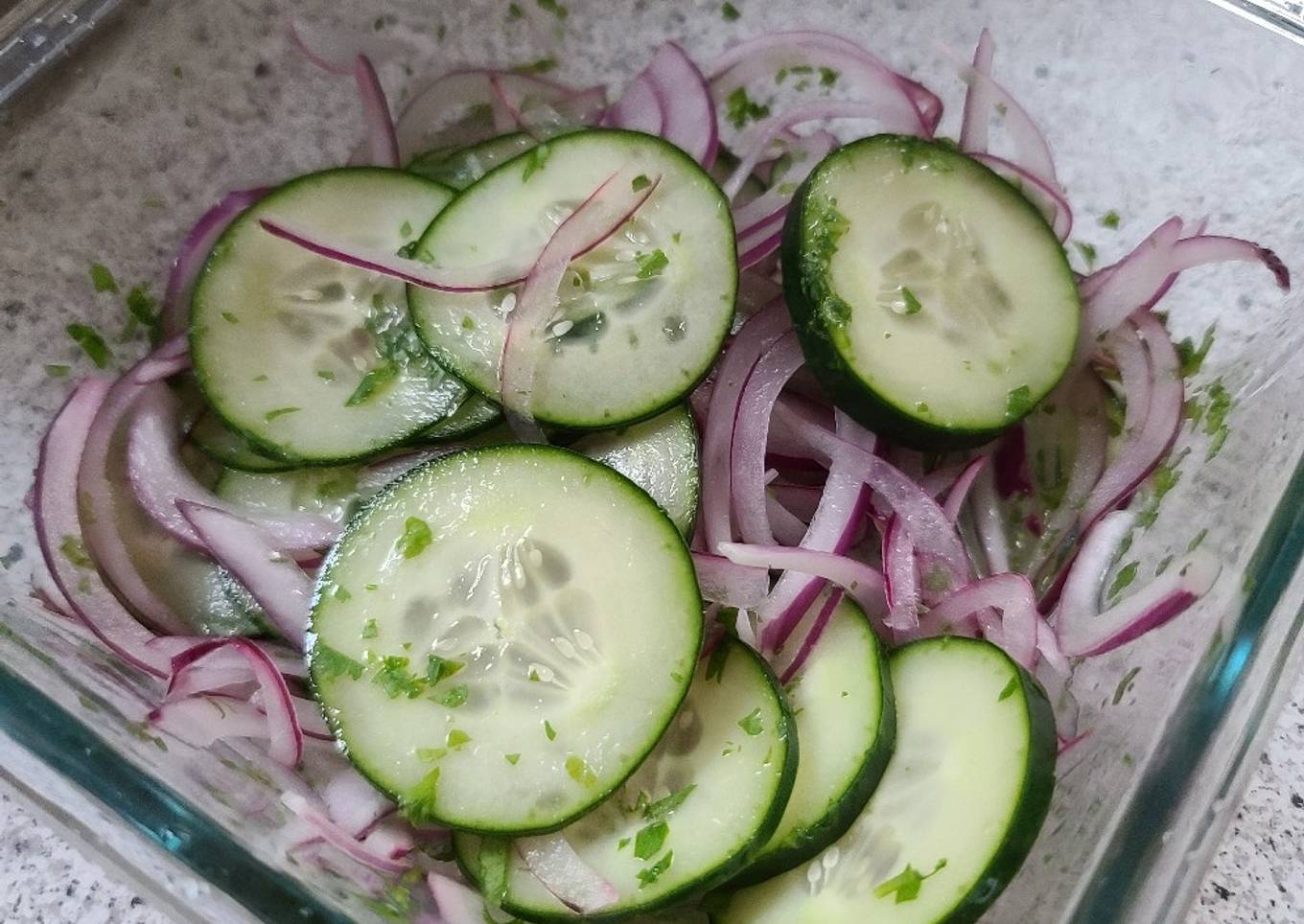 - Enjuaga la cebolla, con agua fría, y dentro de un recipiente mezcla la cebolla, el pepino, el cilantro, una tapita de zumo de limón y sal al gusto. Acompaña tus comidas con esta deliciosa y saludable ensalada.