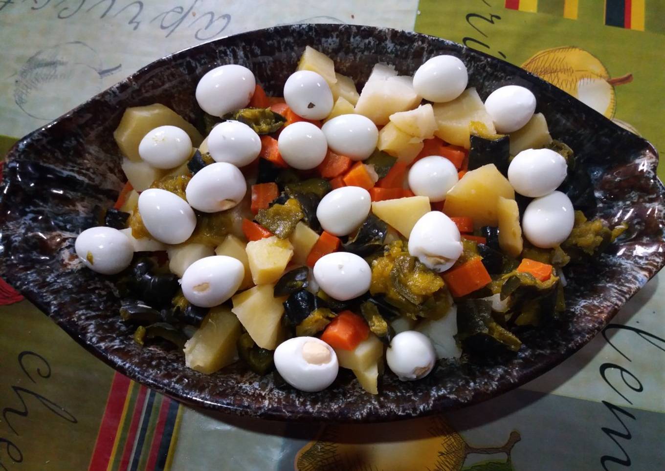 - Trozar verdura y colocar en una fuente y encima colocar los huevitos agregar aceite y una pizca de vinagre y buala !!!!! A disfrutar