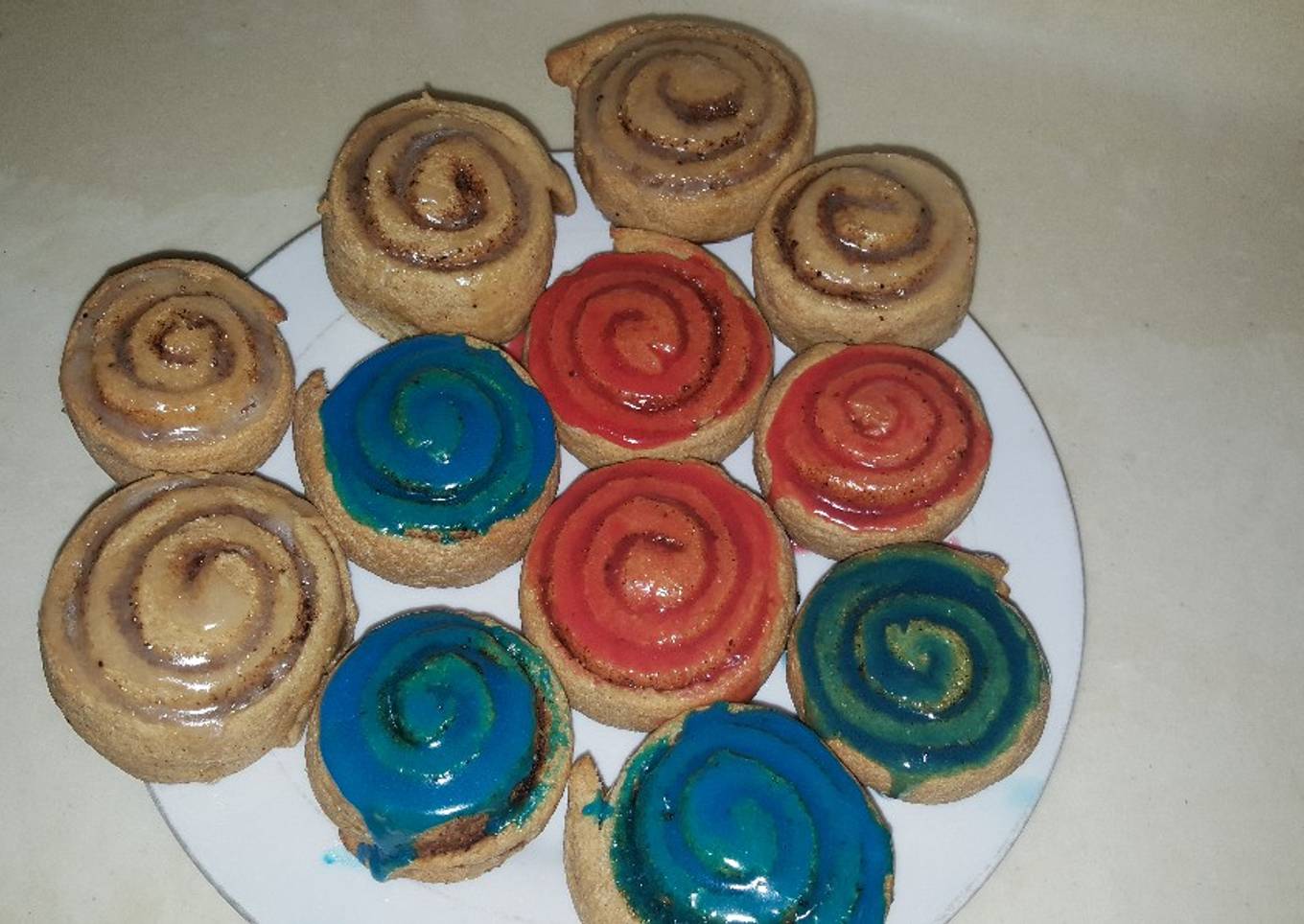 - Para hacer el glaseado mezcla el azúcar glass con la leche y el extracto de vainilla y el colorante. Modifica la cantidad de leche para hacer más o menos cremoso el glaseado de los rollos de canela. Decora cada rollo con esta crema, deja reposar para que endurezca y disfruta.