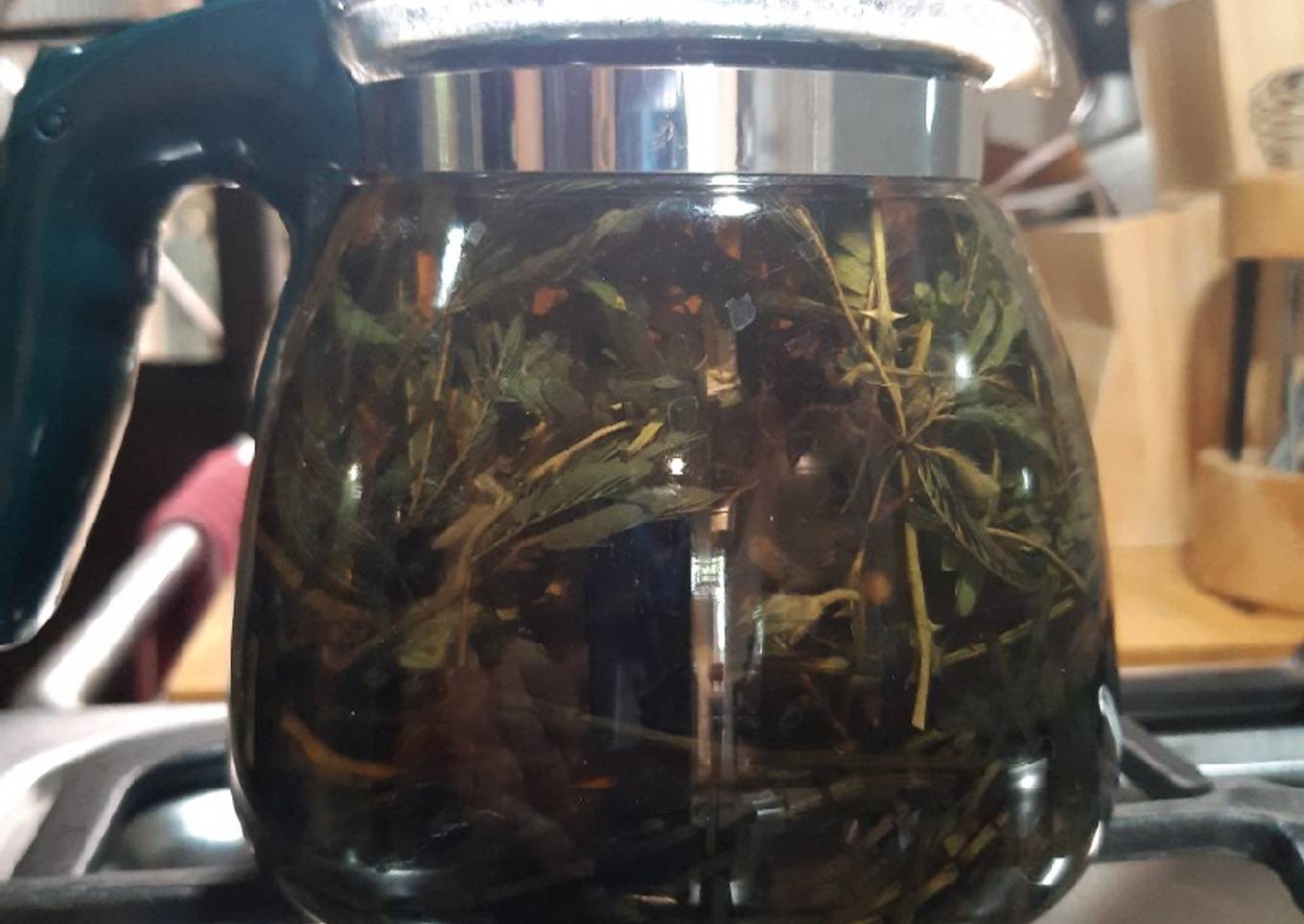 - En una tetera mediana poner a tu discrecíon, Sarsaparilla, cola de caballo y Dormilona. Echar el agua en la tetera,