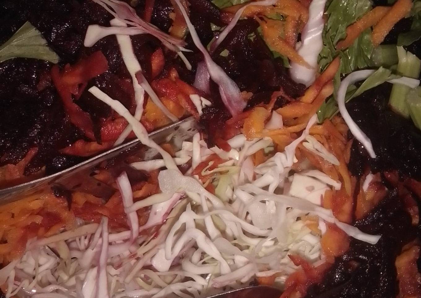 - Pelar, enjuagar y rallar la remolacha, volcar sobre el repollo