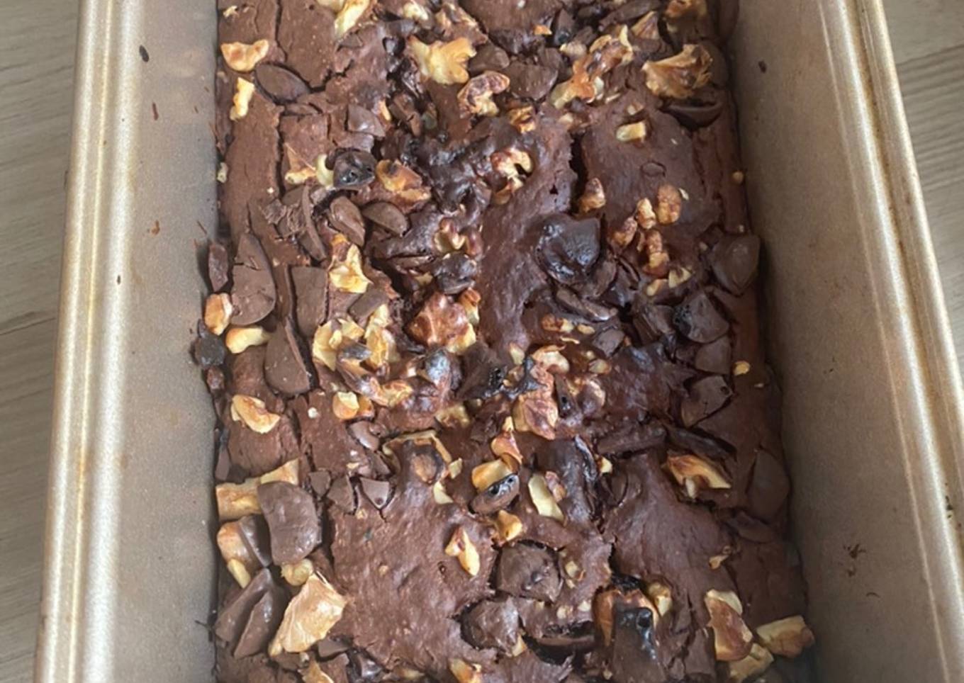 - Vierte la mezcla en una fuente para horno engrasada. Agrega las nueces y el chocolate.