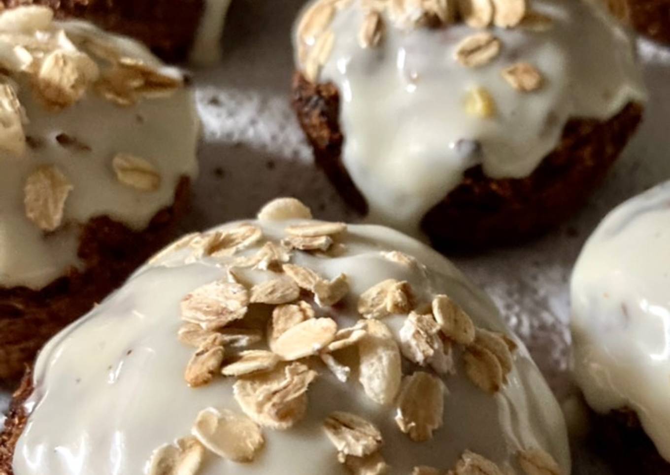 - Una vez retirados los muffins del horno, luego de desmoldarlos y dejarlos enfriar; bañarlos con el frosting y decorarlos con nueces a gusto o granola.