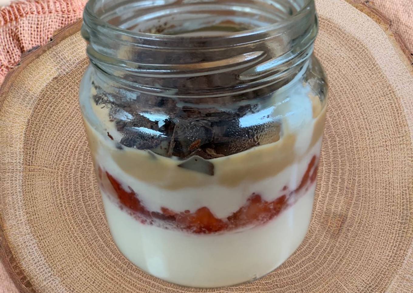 - Agrega una capa de manjar, cubriendo por completo la capa anterior de yogur.