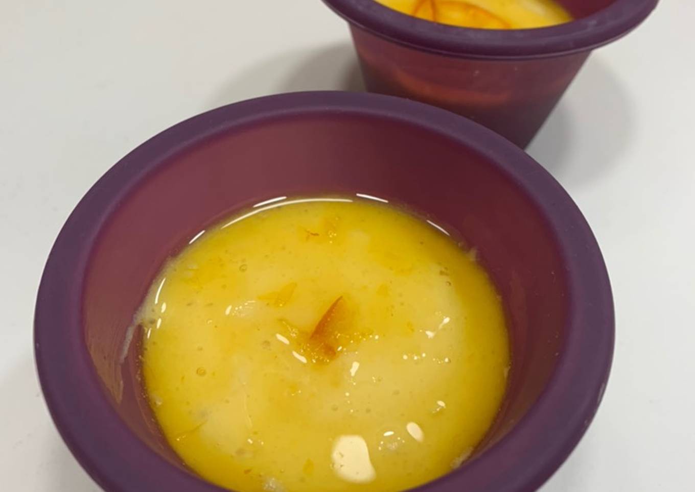 - SI USAS GELATINA EN POLVO: disolver bien la gelatina en un poco agua fría, dejar reposar unos minutos, se quedará como una especie de gel. Después calentarla unos segundos en el microondas (sin hervir) y remover hasta que quede textura líquida. Mezclar con el batido de naranja, yogur y azúcar y meter a la nevera unas 2 horas.