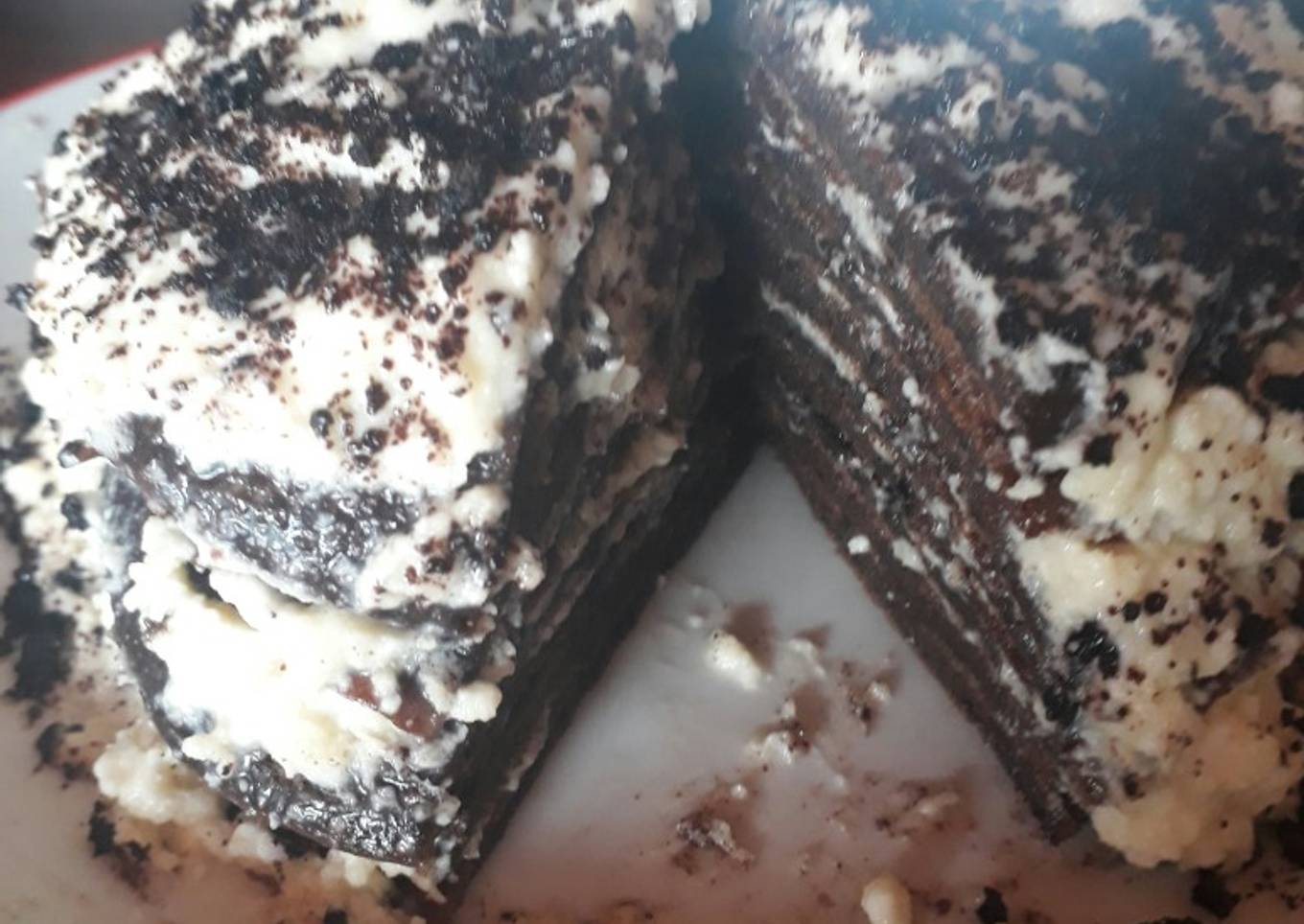 - Ahora armar nuestras crepas !!! En un plato poner una crepa, la crema y un poco de galletas que trituramos, agregar otra crepa arriba, la crema y la galletas trituradas y así hacemos con todas hasta la última crepa...