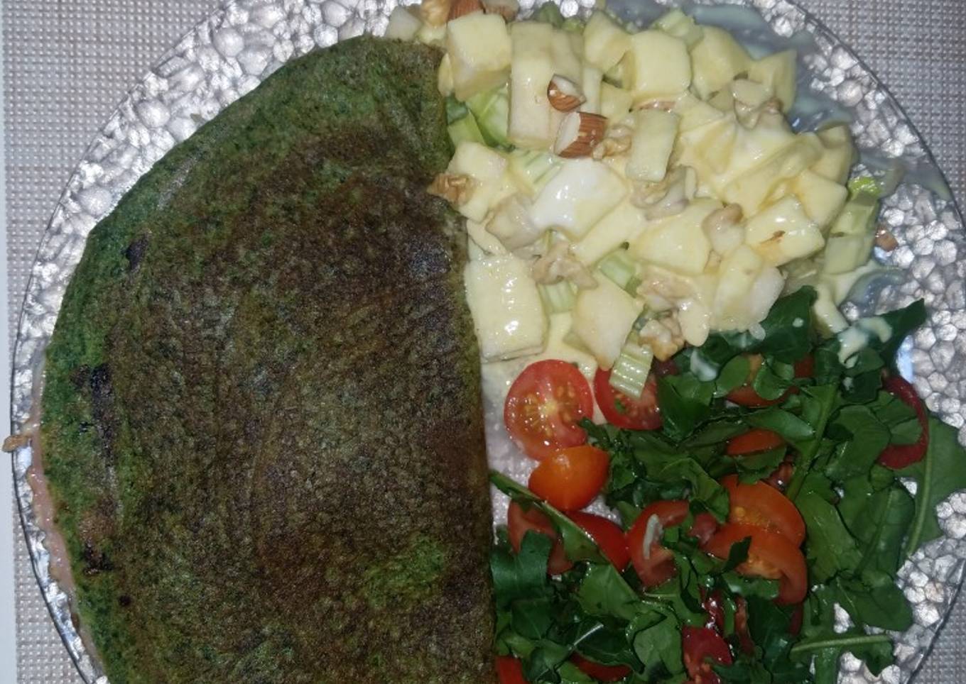 - Rellenar con lo que más te guste. Yo usé jamón natural, queso cremoso light y unos cherries. Lo acompañe con ensalada waldorf y ensalada de rúcula y tomate.