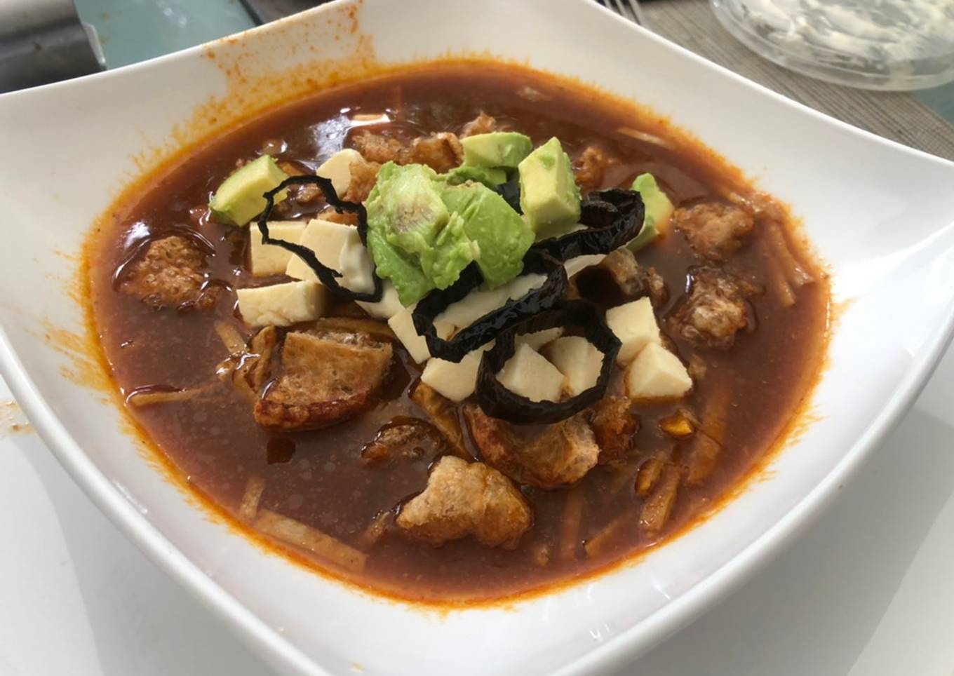 - En un plato hondo servimos las tiras de tortillas y el caldo, lo decoramos con haros de chile frito cubos de panela o queso fresco, chicharrón, aguacate y crema y agregamos el caldo.