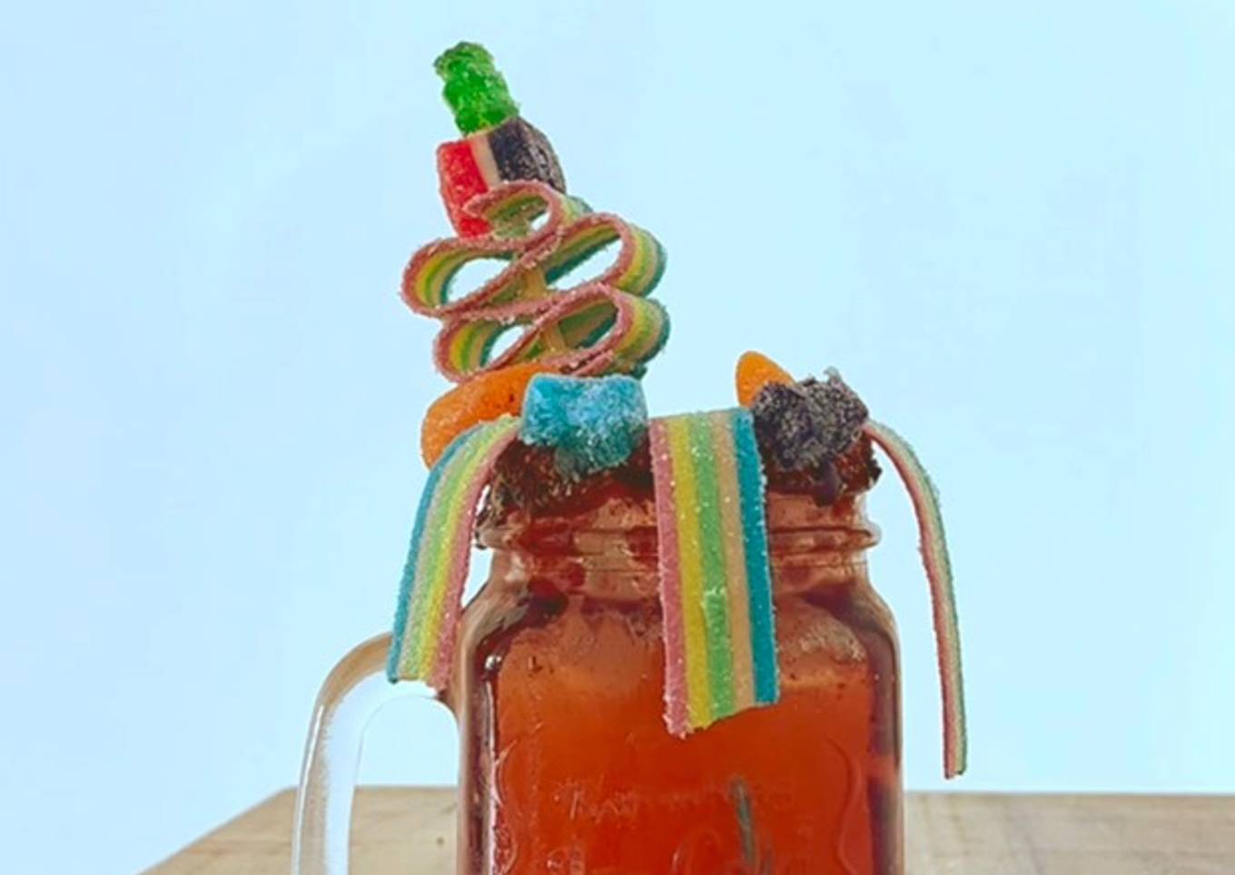 - Agrega el hielo, y luego la cerveza. Decora el borde con gomitas, yo usé de arcoíris y estas de al partilas quedan más pegajosas y puedes pegarlas. También puedes decorar con una banderilla con tus gomas favoritas, las ácidas le van de maravilla.